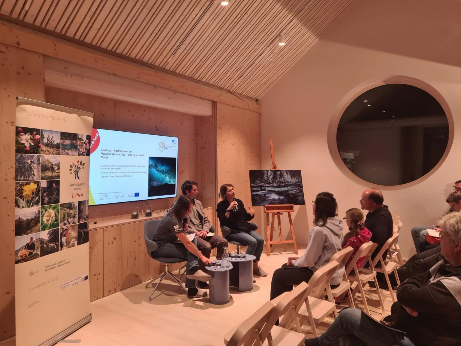 In einer anschließenden Podiumsdiskussion berichtete Gabriele Trinker, Geschäftsführerin des Naturparks Sölktäler, über den Aufbau von „Sternenplätzen“ in Kooperation mit den Gemeinden. Zudem zeigte sie auf, wie der Tourismus um diese Plätze mit einem durchdachten Besucherlenkungskonzept im Einklang mit den Menschen vor Ort und der Natur gelingen kann.
