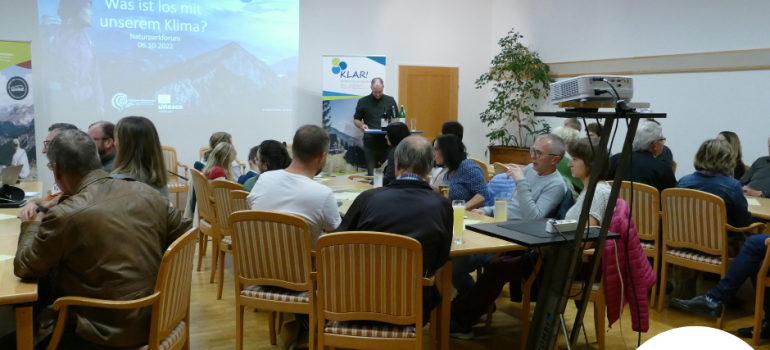 Das Naturparkforum, ein etabliertes Regionalformat Anfang Oktober, widmete sich 2022 dem Thema „Was ist los mit unserem Klima?“. Ziel war es, die Bevölkerung über den Klimawandel zu informieren, regionale Perspektiven einzubinden und Diskussionen mit Expert:innen und Bürger:innen zu ermöglichen.
