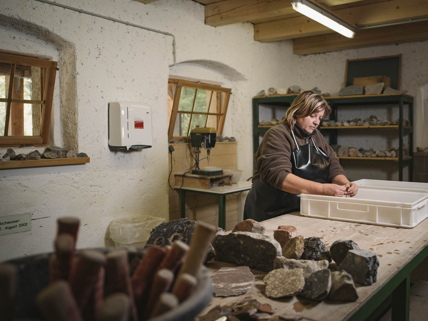 Selbst Arbeiten ist in der GeoWerkstatt (beim Parkbad Gams) die Devise. Unter fachlicher Betreuung hat der Besucher die Möglichkeit Fossilien zu sammeln und sie von Gestein freizulegen. Zusätzlich lassen sich unter dem Mikroskop Reste winziger Lebewesen beobachten, welche vor vielen Millionen Jahren im Meer gelebt haben. Unter diesem Motto und dem erlernten Wissen werden selbst gewöhnliche Bachsteine geschnitten, geschliffen und poliert und zu einem persönlichen Erinnerungsstück.
